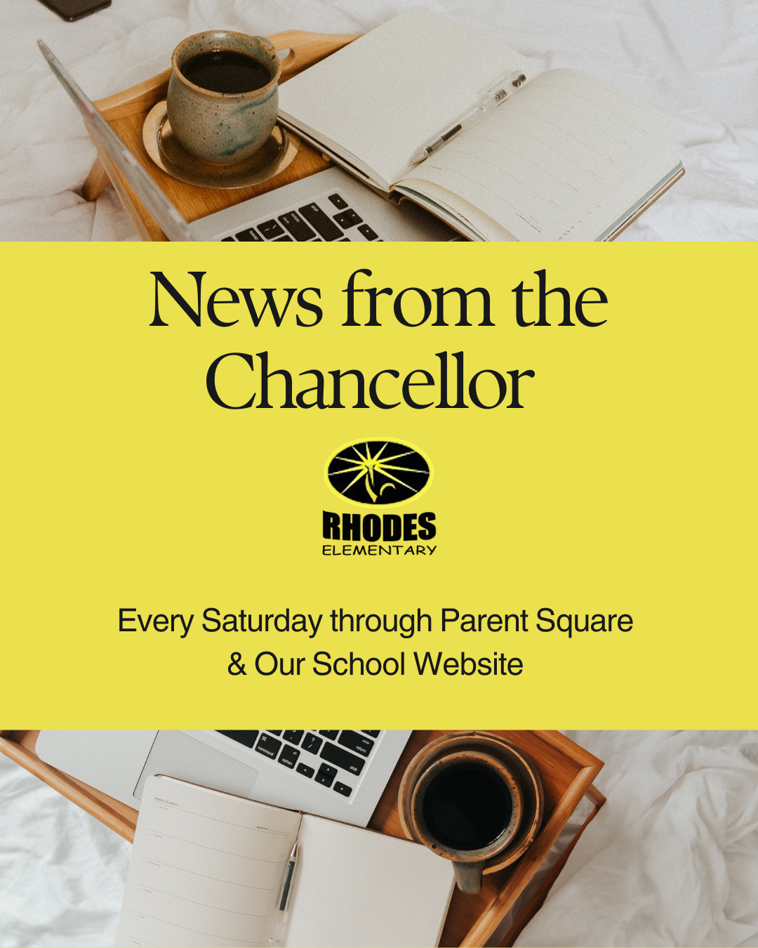 promoting Rhodes Elementary School social media presence, with icons for Twitter, Instagram, and Facebook.